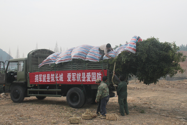 下午3點(diǎn)50分,八輛一字排開的軍車全部裝上了苗木,并進(jìn)行了仔細(xì)的遮蓋和捆綁。隨后,在噼噼叭叭的鞭炮歡送聲中,車輛徐徐開出基地,向舟山方向駛?cè)ァ?/p>