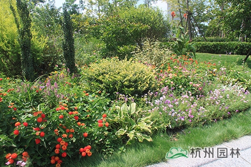 人來人往的杭州火車東站西廣場(chǎng),草坪碧綠,樹木蔥郁,更有一座名為“西湖印象”的立體花壇吸引著眾多游客的眼。而在廣場(chǎng)通往天城路方向的一片草坪里,一處100平方米左右的花境小品卻格外引人注目,紅黃粉交相輝映的五色梅、葉秀花艷的香彩雀、紫色優(yōu)雅的翠蘆莉、飄逸秀氣的小兔子狼尾草、青翠挺立的直立冬青、葉色嫩黃的黃金香柳……豐富的品種,艷麗的色彩,既展現(xiàn)出植物的色彩美,又營造出豐富的群落美,使得這處小花境成為這片風(fēng)景的點(diǎn)晴之筆。
